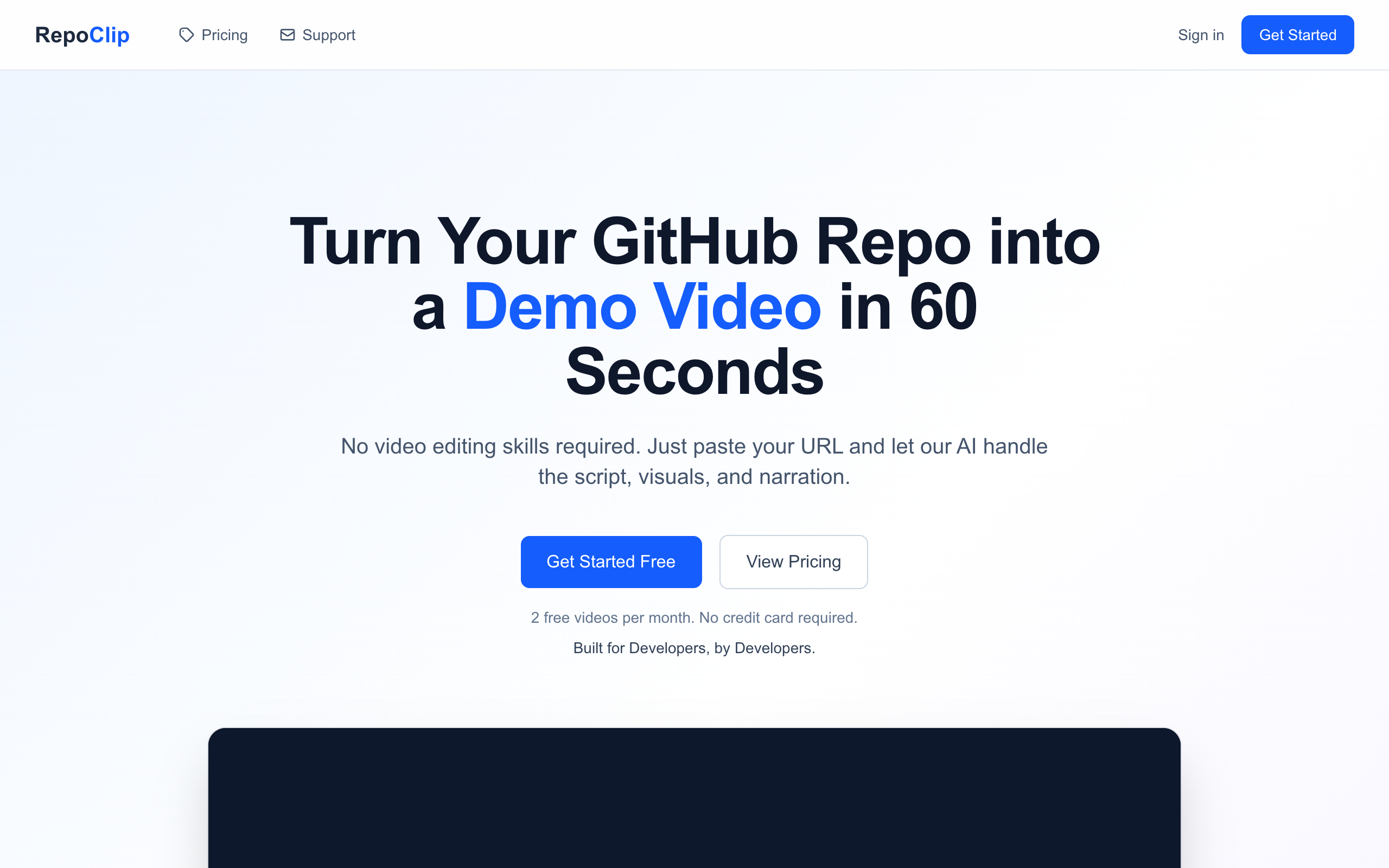 Head over to repoclip.io and paste any public GitHub URL to generate your first video for free. Your code deserves to be seen, not just read.